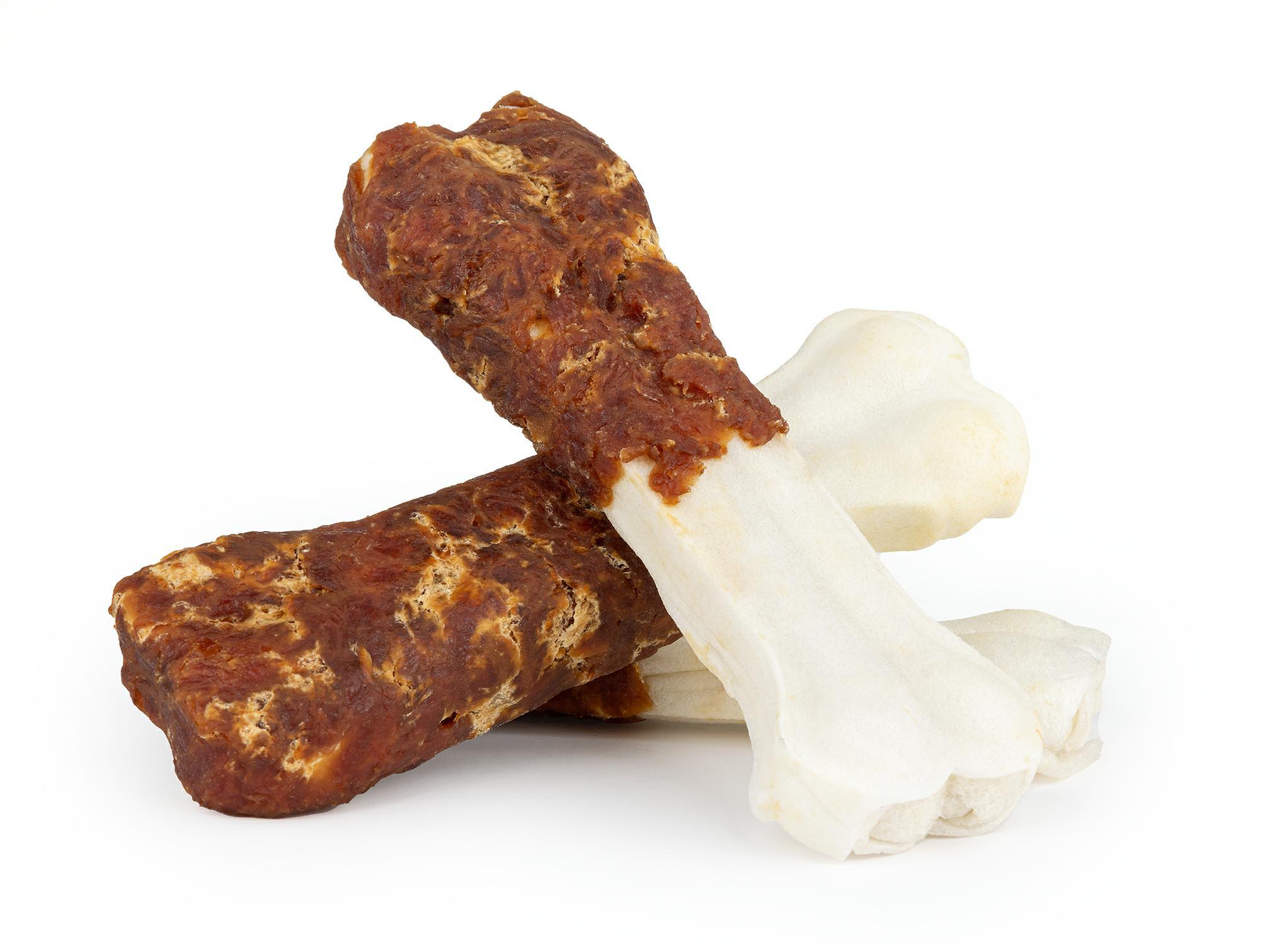 Biała, prasowana kość ze skóry wołowej owinięta mięsem z piersi kaczki.