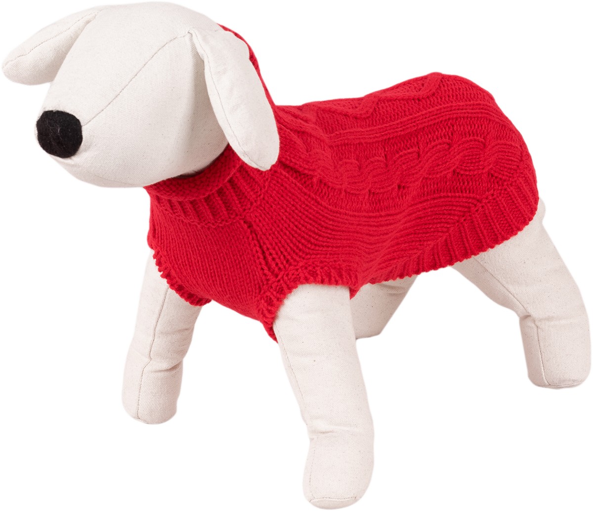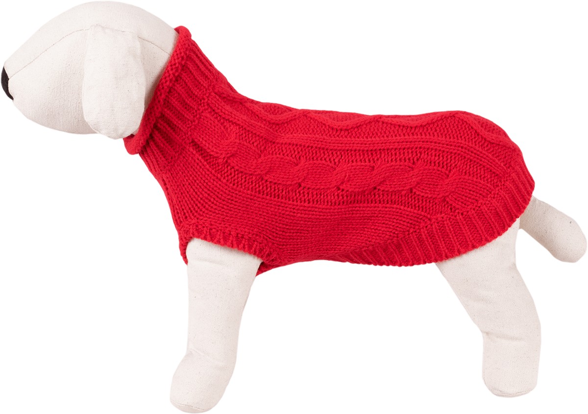 Lekki i ciepły czerwony sweterek z warkoczowym splotem. Wygodny oraz miękki w dotyku, zakładany przez głowę, ze ściągaczem przy szyi. Krój idealnie dopasowany do sylwetki zwierzęcia gwarantuje doskonałą ochronę przed chłodem w okresie jesienno-zimowym. Długość grzbietu 30 cm.