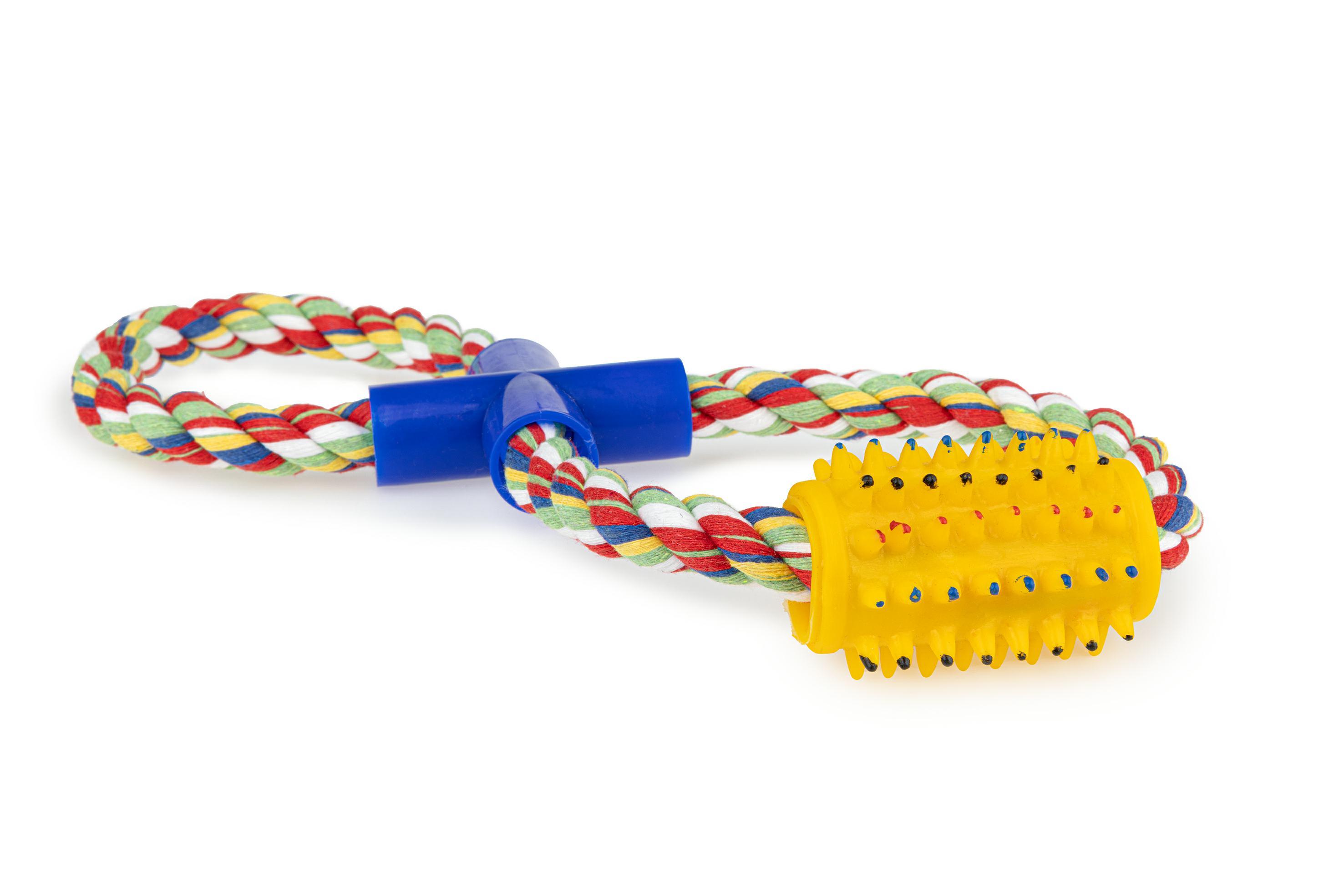Wykonana z wytrzymałego kolorowego sznurka zaplecionego w ósemkę, z kolczatą zabawką do gryzienia. Solidny splot przetrwa nawet wielogodzinne gryzienie i szarpanie, co dodatkowo pomaga zachować higienę jamy ustnej pupila – podczas żucia sznurka włókna dostają się między zęby efektywnie je czyszcząc. Produkt świetnie sprawdza się podczas zabaw w aportowanie i przeciąganie, oraz umila czas czworonożnym pupilom w czasie oczekiwania na powrót właściciela. Zabawka przeznaczona jest dla dużych i średnich psów.